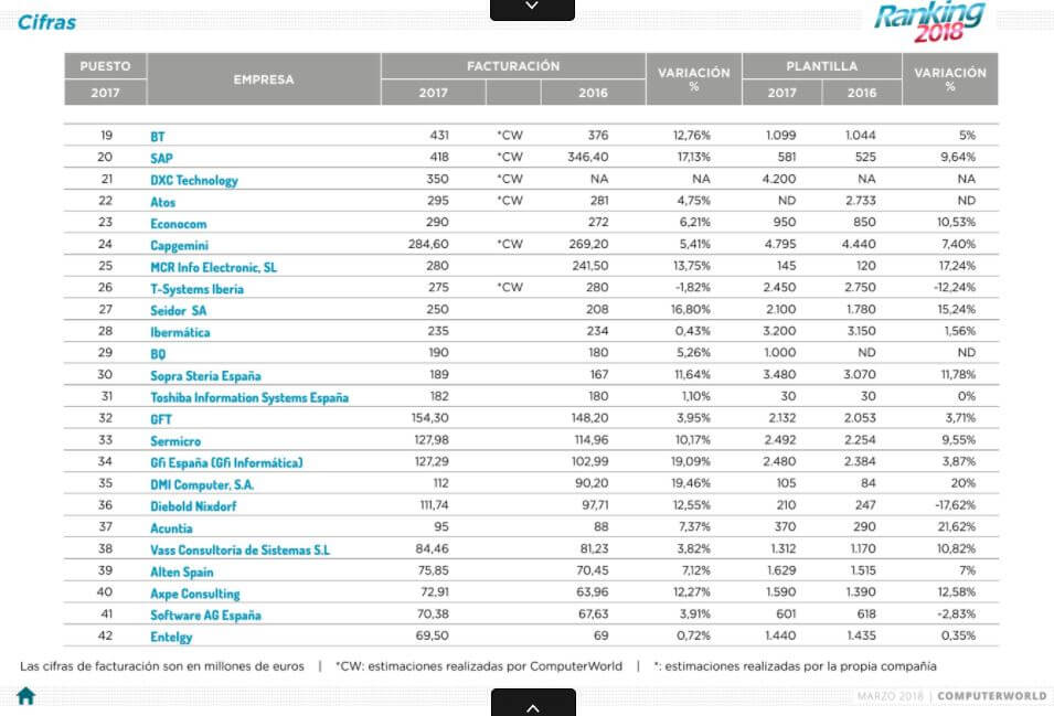 El “Ranking de ComputerWorld 2018” es preparado anualmente por ComputerWorld, el medio digital de IDG Communications. La lista presenta las 100 empresas más grandes especializadas en Tecnologías de la Información y la Comunicación en España. El primer puesto de este año es para Telefónica, con ingresos que superan los 12 mil millones de euros, seguida de Orange y Vodafone España.